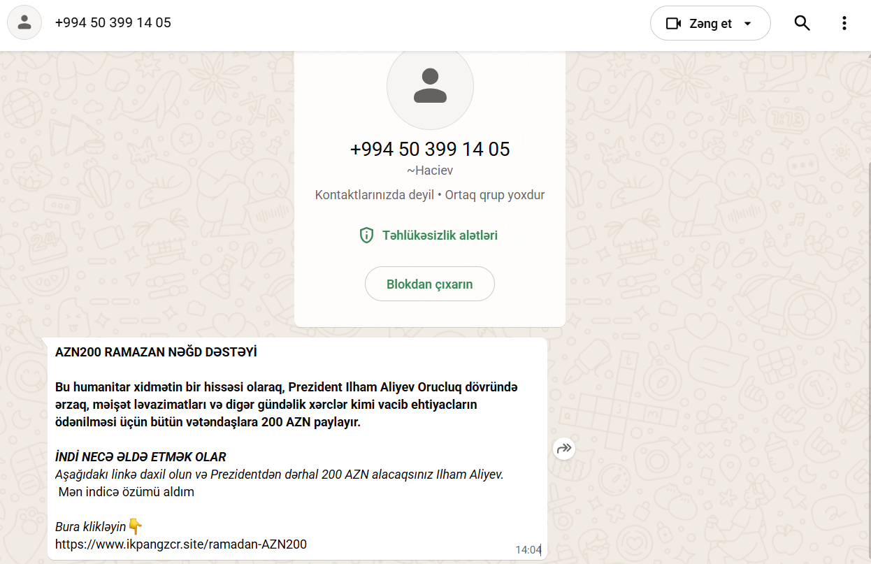 Qaynarinfo xəbər verir ki, son günlərdə Azərbaycan vətəndaşlarına dövlət və rəsmi şəxslər adından "WhatsApp" vasitəsilə saxta mesajlar göndərilir.